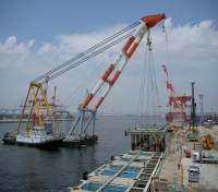 本工事は、横浜港本牧地区のジャケット式岸壁を築造するものです。桟橋上部撤去工、桟橋下部撤去工、基礎工、本体工、付属工、雑工、仮設工及び共通工を実施しました。