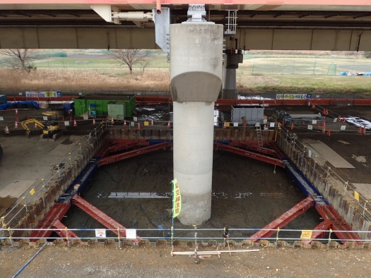 本工事では、新大宮バイパス笹目橋上りのP4、P5、P9橋脚および笹目橋下りのP8橋脚において、鋼板巻き立て工法による耐震補強工事を実施しました。