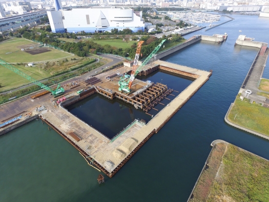本工事では、新砂水門再整備(新設)の一環として、水門構築のための仮締切と基礎杭を打設する工事を行いました。