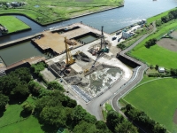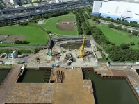 本工事では、新砂水門の新設工事における、背面地の地盤改良工事および既設遊歩道の切回し工事を行いました。