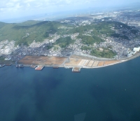 本工事では、北九州市若松区の洞海湾に面する、旧国鉄貯炭場跡地13.9haの開発造成工事を行いました。本開発地区は、若戸大橋から西へ2km、背面の丘にある岬山公園からは洞海湾を一望できる景観の美しい場所です。広大な用地の東側は、戸建宅地69区画と集合住宅用地および緑地公園を造成し、海岸沿線に約1kmの道路が伸びています。