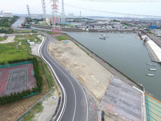 本工事では、四日市港霞ヶ浦北ふ頭地区霞4号幹線道路の陸上改良工、RC橋脚工、撤去工、迂回路工等を施工しました。