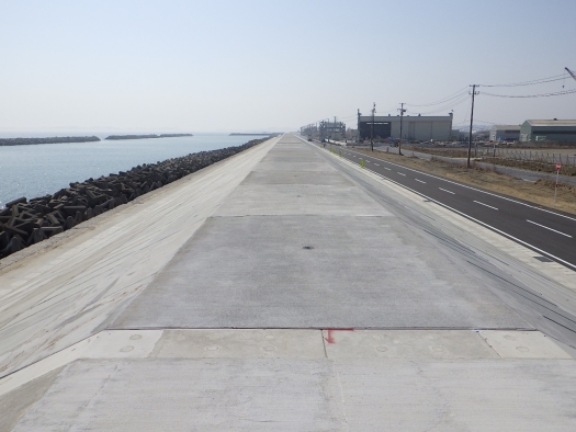 本工事では、東日本大震災により被災した石巻市西浜町において、災害復旧として防潮堤および臨港道路を築造する工事を行いました。