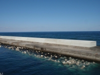 本工事では、港内の静穏度向上のために、基礎捨石、被覆石を投入後、消波ブロック据付を100m(472個)を実施し、防波堤の越波対策として上部の嵩上げ工事を107m(コンクリート打設量3,259m3)行いました。