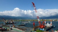 本工事では、事業の初期段階の工事で、古い岸壁の取壊しを行い、新設する耐震強化岸壁の床掘および基礎捨石の施工を行いました。また、船舶の大型化に対応するように航路および泊地の浚渫も行いました。